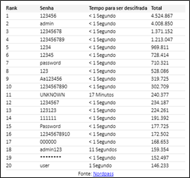 Uma prova disso é a tabela a seguir, resultado de uma análise de um banco de dados contendo credenciais de acesso expostas em incidentes cibernéticos.