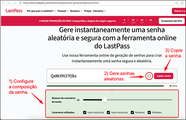 Se quiser auxílio para gerar uma senha forte, você pode utilizar um gerador de senhas, como o LastPass (Gerador de senhas – LastPass).
